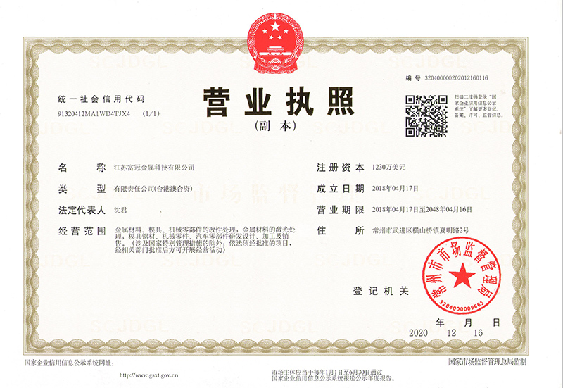 江蘇富冠金屬科技有限公司(以下簡稱:“公司”)成立于2018年4月,隸屬于鑫昌泰集團(tuán),是常州市經(jīng)開區(qū)招商引資的重點外資企業(yè),注冊資本1230萬美元,座落于常州市經(jīng)開區(qū)橫山橋智能裝備產(chǎn)業(yè)園,占地面積22762.8平方米,員工總數(shù)100人。公司主要經(jīng)營:金屬材料、模具、機械零部件的改性處理;金屬材料的激光處理;模具鋼材、機械零件、汽車零部件研發(fā)設(shè)計、加工及銷售。并具有真空淬火、普通淬火、調(diào)質(zhì)、去應(yīng)力回......